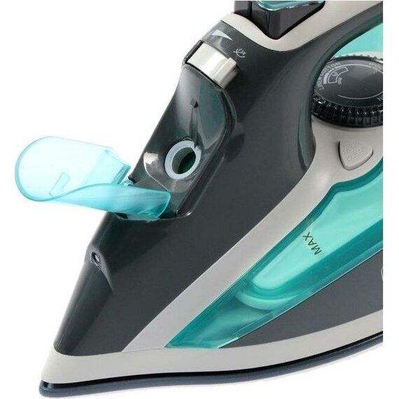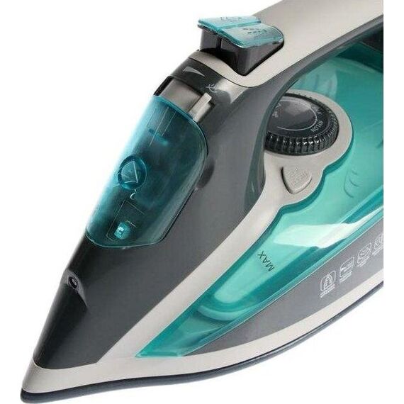 Мощность 2600Вт, резервуар для воды 400мл, керамическая подошва (233х122 мм), сухое глажение / глажение с пароувлажнением, регулировка подачи пара, мощный паровой удар, вертикальный пар, автоматическое отключение (через 8 мин без движения в вертикальном положении и через 30 сек в горизонтальном положении), самоочистка, защита от протекания и накипи (anti-drip и anti-calc), световой индикатор работы, кабель питания 2 м. Цвет: серый/бирюзовый.