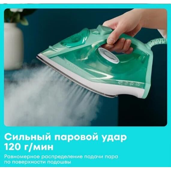 Мощность, Вт: 2000 Регулируемый пар до г/мин: 40 Паровой удар до г/мин: 120 Резервуар для воды, мл: 190 Функция разбрызгивания воды: Да Терморегулятор: Да Покрытие подошвы: Керамическая подошва KeramoPro Размер утюга Ш*В*Г, мм: 240х123х105 Длина электрошнура, м: 1.5 Цвет: Мятный