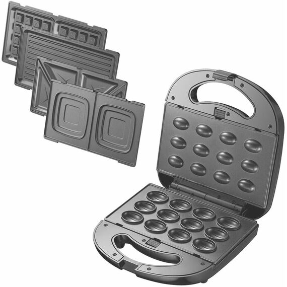 5 вида насадок: сэндвичи, гриль, вафли, орешки, печенье, антипригарное покрытие, защита от перегр, 750 Вт. Быстрый Высокая мощность прибора позволяет в кратчайший срок набрать рабочую температуру и приступить к работе. О готовности мультипекаря к работе Вы можете судить по специальному индикатору готовности. Лакомства без хлопот Мульти пекарь позволяет Вам приготовить множество блюд: тонкие вафли, Венские вафли, гриль, яичницу, омлет, горячие бутерброды, десертные орешки … и другие замечательные лакомства