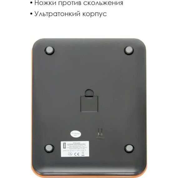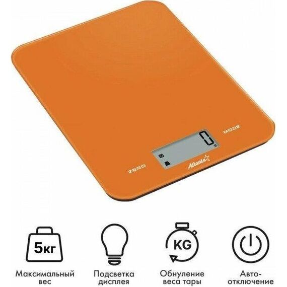 ATLANTA ATH-6197 (ORANGE) Стеклянная рабочая поверхность, максимальный вес 5 кг с шагом 1 г, LED-дисплей. ПОЛНОСТЬЮ ЭЛЕКТРОННЫЙ Полностью электронный принцип взвешивания на высокоточных сенсорах гарантирует точность измерения веса, а благодаря отсутствию механических механизмов, весы прослужат многие годы