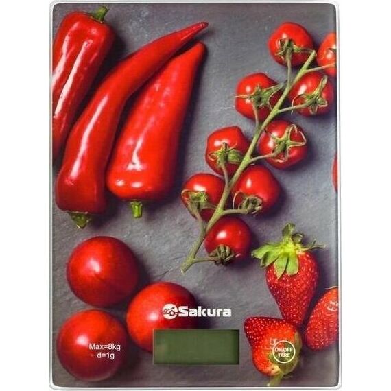 Электронные, нагрузка 8 кг, цена деления 1 г, ЖК дисплей, учет веса тары, автомат.отключение, индикатор перегрузки и заряда батарейки, питание 1*CR2032 , пластиковый корпус, рабочая поверхность из прочного стекла, рисунок: перцы.