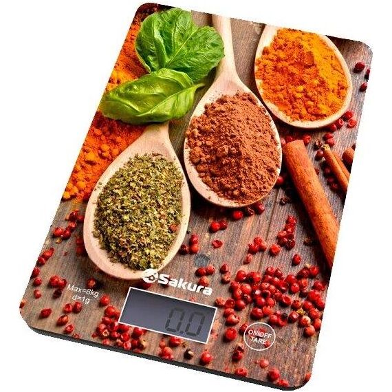 Электронные, нагрузка 8 кг, цена деления 1 г, ЖК дисплей, учет веса тары, автомат.отключение, индикатор перегрузки и заряда батарейки, питание 1*CR2032 , пластиковый корпус, рабочая поверхность из прочного стекла, рисунок: специи/темн.дерево.