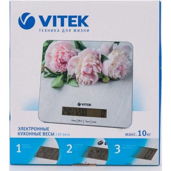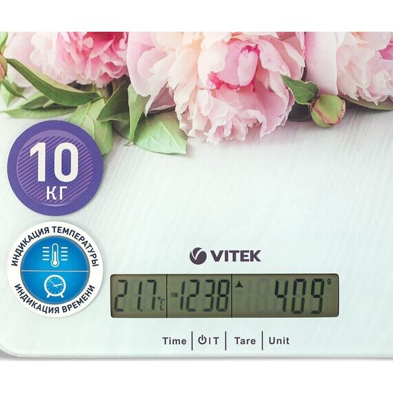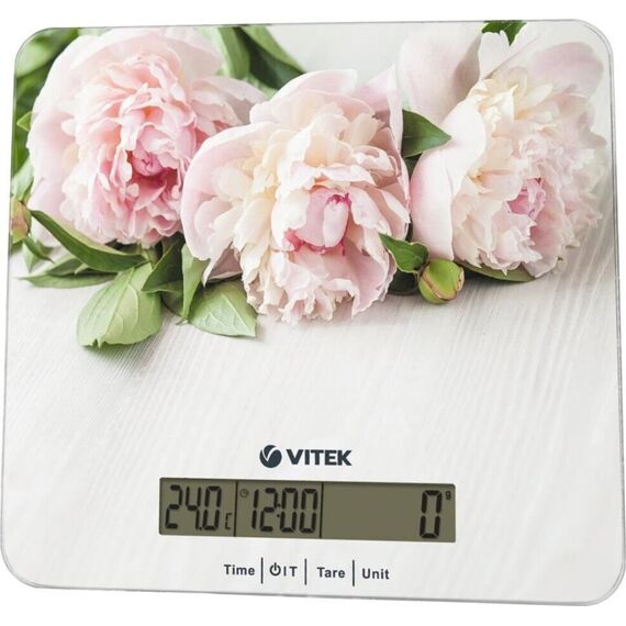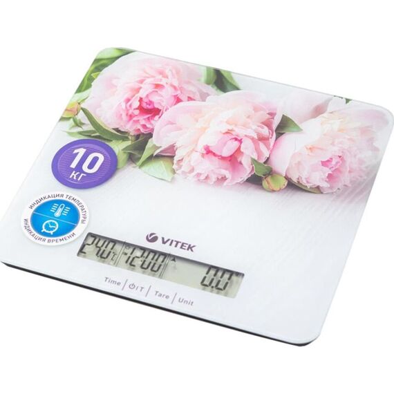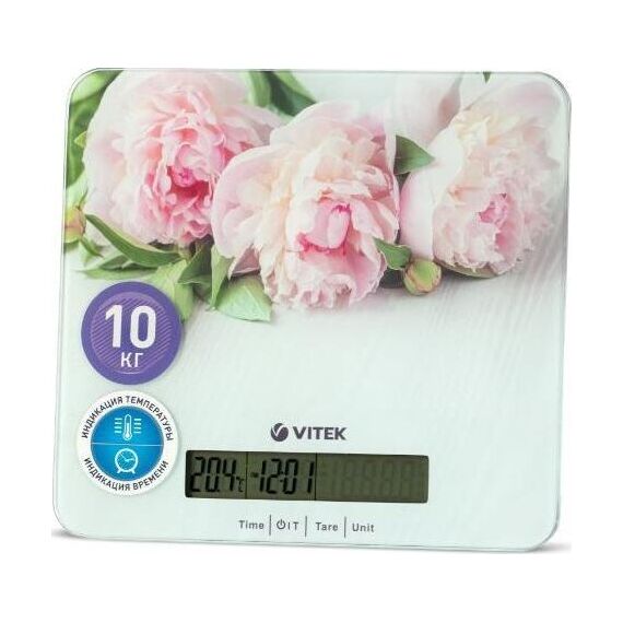 Весы кухонные, электронные. Предел взвешивания: 10 кг, Точность измерения: 1 грамм, Размер платформы: 20х18,3 см, Размер дисплея: 95х18 мм, Встроенные часы, Индикация заряда батареи, Индикация перегрузки, Индикация температуры, Тарокомпенсация, Последовательное взвешивание, Тип элементов питания: 1хCR2032 ( в комплекте), Автоматическое выключение, Материал корпуса: пластик, Материал чаши: стекло, Количество отображаемых цифр: 4, Конструкция тары: платформа, Цвет: Принт ( пионы)