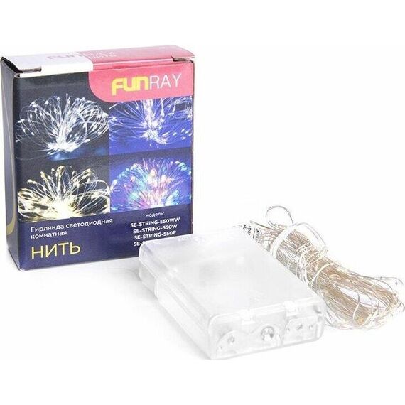 LED гирлянда FUNRAY "Нить", SE-STRING-550WW, 5м, 50 LED, теплый белый, 3*АА, серебр. шнур 0,3м,