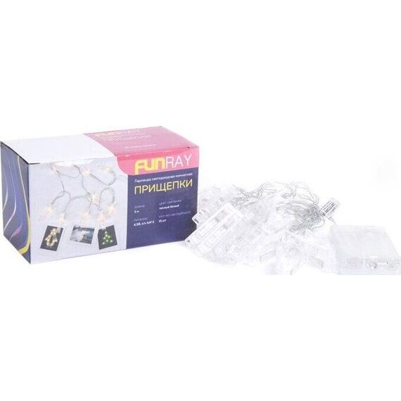 LED гирлянда FUNRAY "Прищепки", SE-CLIPS-315WW, 3*АА, 3м, 15LED,теплый белый, прозр шнур 0,5м,