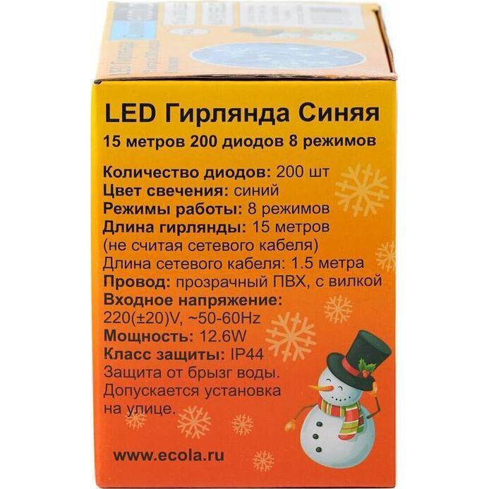 Светодиодная гирлянда Ecola LED. Прозрачный провод с вилкой. Тип: нить Кол-во диодов: 200 Led Напряжение: 220V Цвет: синий 8 режимов Степень влагозащищенности: IP44 Длина: 15 м