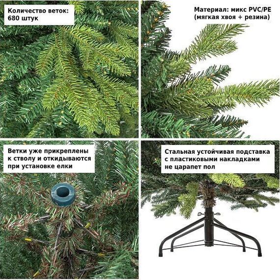 Искусственная ель Arkansas Premium станет замечательным украшением дома в праздники. Пушистые ветки выполнены из микса материалов PVC и PE, благодаря чему дерево выглядит максимально похожим на настоящую елочку. Компания Royal Christmas производит елки в соответствии с международным стандартом противопожарной безопасности (NEN EN 71-2) для установки внутри помещения без риска возгорания. Высокое качество изделия способствует долгому сроку службы – более 20 лет. Ель надежно закрепляется на стальной подставке, а процесс сборки не займет много времени. Благодаря просторной коробке елку можно аккуратно упаковать и удобно хранить в течение года. Искусственная ель Arkansas Premium – это не только роскошный внешний вид, но и выгодное соотношение цены и качества. • Высота: 150 см • Диаметр: 96 см • Вес нетто: 6 кг • Материал: микс PVC/PE (мягкая хвоя + резина) • Количество веток: 680 штук • Цвет: зеленый • Размер коробки: 99,06х25,4х33,02 см • Вес брутто: 7,1 кг • Производитель: Royal Christmas • Страна: Китай