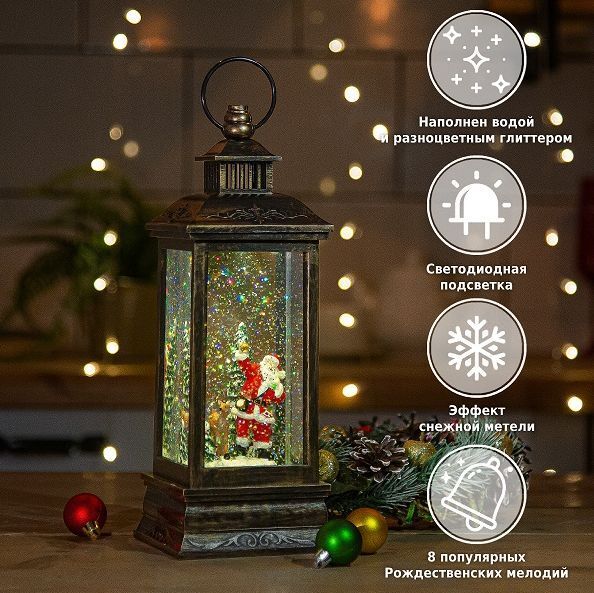 Декоративный новогодний фонарь Winter Glade станет ярким украшением дома в период новогодних и рождественских праздников. Работает фонарь от 3 пальчиковых батареек типа АА (в комплект не входят), USB шнура (входит в комплект) или сети 220V (адаптер в комплект не входит). Фонарь имеет 2 рабочих режима: 1 - подсветка, механизм мерцания, кружится снег и начинают играть по очереди 8 мелодий; 2 -подсветка + механизм мерцания без музыки. Размер фонаря: 10,5х10,5х27,5 см • Материал: пластик • Питание: 3*AA + USB + адаптер 220V • Тамер: да, на 6 часов, повторяется каждые 18 часов • Количество и цвет лампочек: 2 шт - тёплый белый LED+ холодный белый LED • Музыка: 8 мелодий • Количество режимов: 2 штуки • Применение: внутри помещения • Размер индивидуальной коробки: 15,5х15,3х32,7 см • Размер транспортной коробки: 49х32,6х34,5 см • Количество штук в коробке: 6 штук • Вес нетто: 1,54 кг • Вес брутто: 1,57 кг • Производитель: Winter Glade • Страна: Китай