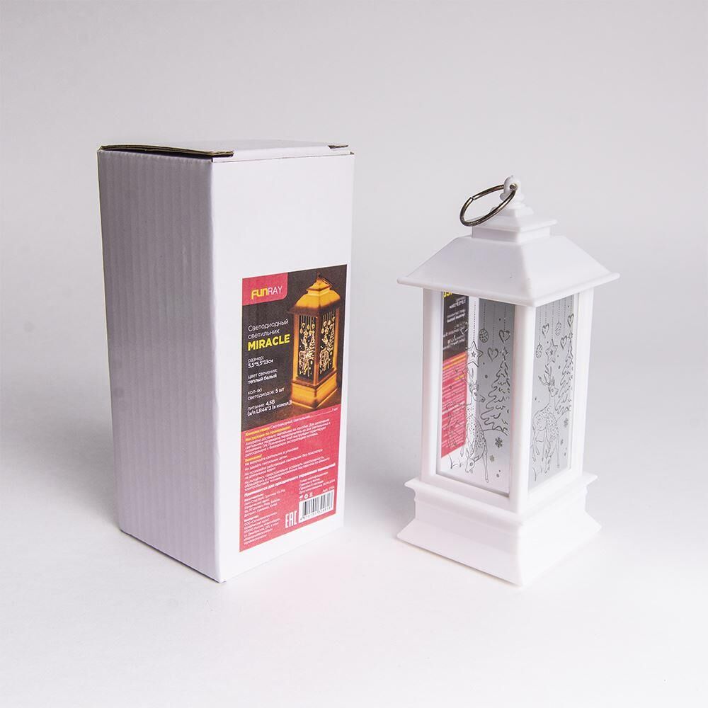 Фонарик новогодний Miracle идеально дополнит праздничное оформление! Его можно разместить под елку, вешать на веточки. Ставить на стол, подоконник и полки. Мягкое теплое белое свечение и красивый узор с оленями и елкой создают волшебную атмосферу и позволяют использовать его в качестве ночника. Внутри светильника 5 светодиодов. Материал корпуса - белый пластик. Фонарик работает от батареек LR44*3 шт. Размер: 5,5*5,5*13 см. Светодиодный светильник Miracle - отличный подарок для детей и взрослых. Подарок для неожиданных гостей и для любителей интерьерных деталей.