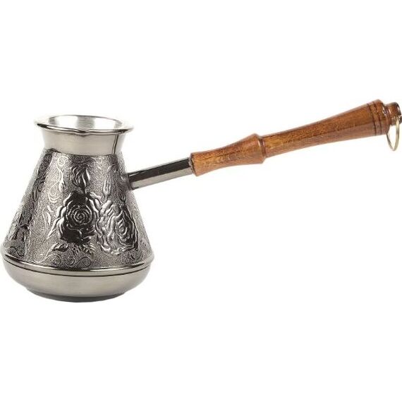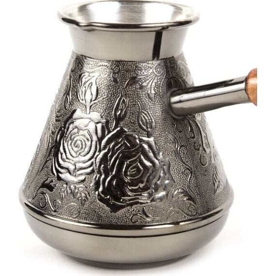 "Роза" Медная турка классической конусообразной формы с утолщённым дном предназначена для приготовления ароматного натурального кофе. Внутренняя поверхность покрыта пищевым оловом. Наружная сторона украшена оригинальным орнаментом. Деревянная ручка является надёжным теплоизолирующим материалом. Подходит для всех типов плит, кроме индукционных. Проста в эксплуатации. Объём: 500 мл.