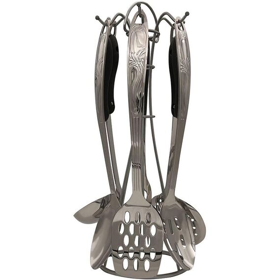 Кухонный набор ZEIDAN Z-2075 7 предм. , Кухонный набор 7пр. НЕРЖАВЕЮЩАЯ СТАЛЬ, металлическая подставка-туба, зеркальная полировка с рисунком (лопатка с прорезями, шумовка, половник, картофелемялка, поварская ложка, поварская вилка ).
