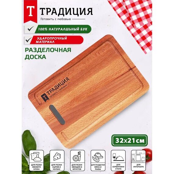 Доска разделочная 32x21x1,6см ТМ Традиция, изготовлена из натуральной древесины. Бук 100%. Не подходит для посудомоечной машины.