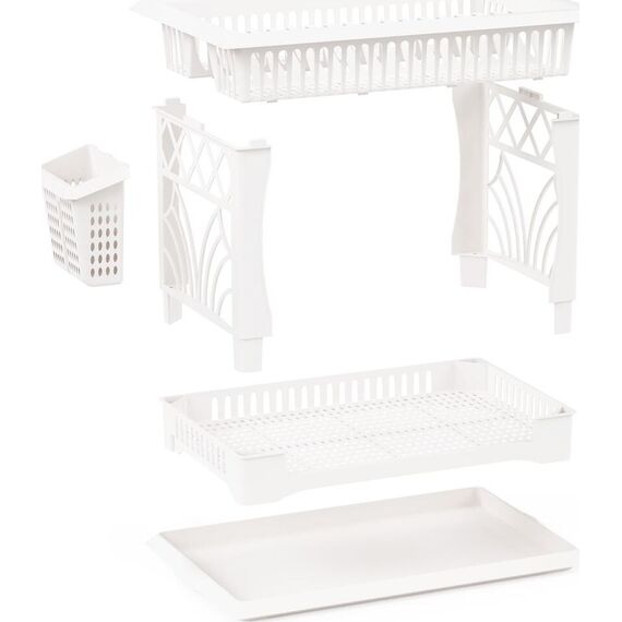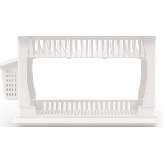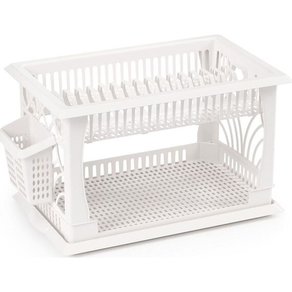 Изделие предназначено для сушки кухонной утвари. Верхний ярус позволяет размещать тарелки, а нижний ярус – чашки или другую глубокую посуду. На боковой стойке, соединяющей два яруса, располагается специальный карман для сушки столовых приборов. Поддон позволяет собрать стекающие капли и защитить поверхность стола от влаги. Вес 1 кг Размеры изделия (ДхШхВ) 480х305х300 мм