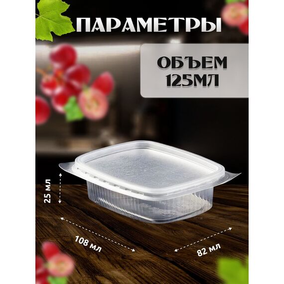 Универсальный компактный контейнер для порционных продуктов Представляем вам готовый набор из прозрачных прямоугольных контейнеров объемом 125 мл и герметичных крышек. Они идеально подходят для фасовки и хранения сметаны, творога, соусов, орехов, сухофруктов, салатов, готовых блюд и полуфабрикатов. Компактный размер 108х82х27 мм удобен для порционной упаковки. Контейнеры и крышки выполнены из прочного пищевого полипропилена (ПП), который безопасен для продуктов и выдерживает заморозку. Упаковка 100 штук — оптимальный выбор для активного использования в кафе, ресторанах и службах доставки.