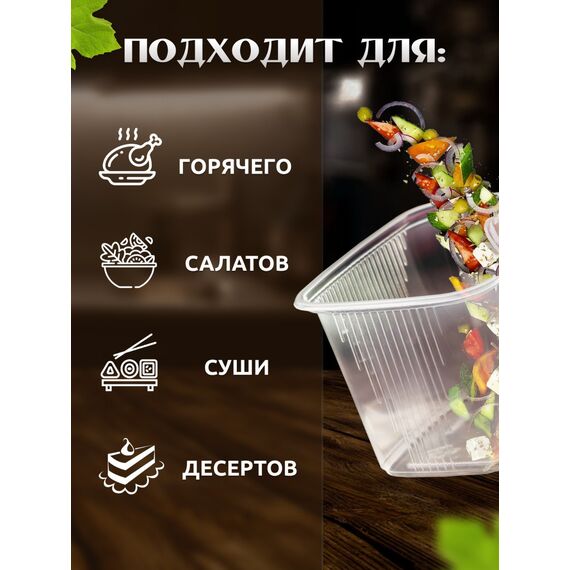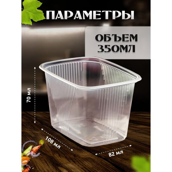Увеличенный объем 350 мл для порционных продуктов и готовых блюд Представляем вам готовый набор из прозрачных прямоугольных контейнеров объемом 350 мл и герметичных крышек. Они идеально подходят для фасовки и хранения сметаны, творога, соусов, орехов, сухофруктов, салатов, готовых блюд и полуфабрикатов. Размер 108х82х69 мм удобен для порционной упаковки. Контейнеры и крышки выполнены из прочного пищевого полипропилена (ПП), который безопасен для продуктов и выдерживает заморозку. Упаковка 400 штук — выгодный объем для крупных кафе, ресторанов и служб доставки.
