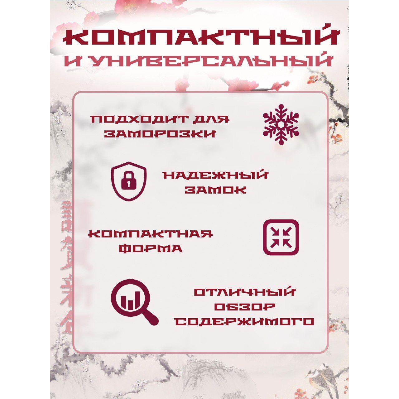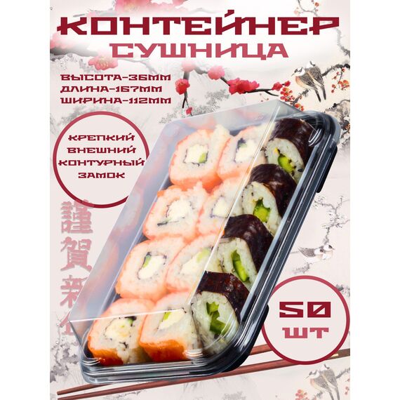 - Идеальный размер — 167х112х44 мм для стандартных порций суши и роллов (до 8-10 шт).