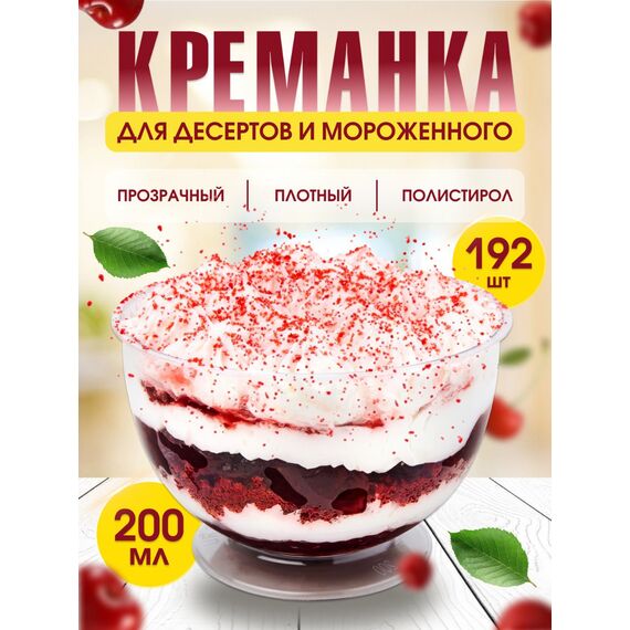 Максимальная выгода для крупных заведений Представляем вам оптовую партию прозрачных креманок "Кристалл" объемом 200 мл. Элегантная форма с характерными гранями, напоминающими хрусталь, привлекает внимание и делает подачу десертов, мороженого, фруктов и закусок особенно красивой. Прозрачный материал позволяет видеть содержимое со всех сторон, что идеально подходит для сервировки стола в кафе, ресторанах, на фуршетах и праздниках. Крупнооптовая упаковка 192 штуки — идеальный выбор для крупных кондитерских, сетевых кафе и производств, обеспечивающий максимальную экономию и долгосрочный запас. Креманки поставляются без крышек.
