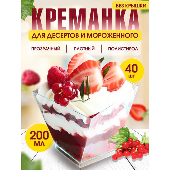 Стильная креманка для эффектной подачи десертов Представляем вам прозрачные креманки "Сапфир" объемом 200 мл. Элегантная граненая форма, напоминающая драгоценный камень, привлекает внимание и делает подачу десертов, мороженого, фруктов и закусок особенно красивой. Прозрачный материал позволяет видеть содержимое со всех сторон, что идеально подходит для сервировки стола в кафе, ресторанах, на фуршетах и праздниках. Упаковка 40 штук оптимально подходит для активного использования. Креманки поставляются без крышек.