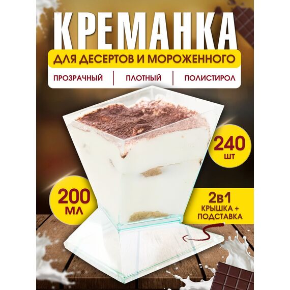 Максимальная выгода для кондитерских, кафе и служб доставки Представляем вам оптовый комплект из прозрачных креманок "Сапфир" объемом 200 мл и герметичных крышек. Это идеальное решение для подачи и упаковки десертов, мороженого, фруктов, салатов и соусов. Элегантная форма, напоминающая драгоценный камень, привлекает внимание и делает подачу особенно красивой. Прозрачный материал позволяет видеть содержимое, а надежная крышка обеспечивает сохранность продукта. Крупнооптовая упаковка 240 креманок + 240 крышек — идеальный выбор для крупных кондитерских цехов, сетевых кафе и производств, обеспечивающий максимальную экономию и долгосрочный запас.