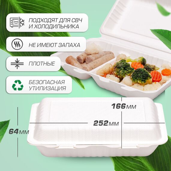 Ланчбокс двухсекционный биоразлагаемый 252х166х64 мм, объем 1000 мл, 50 шт — экологичная упаковка для еды от производителя «Aurora»