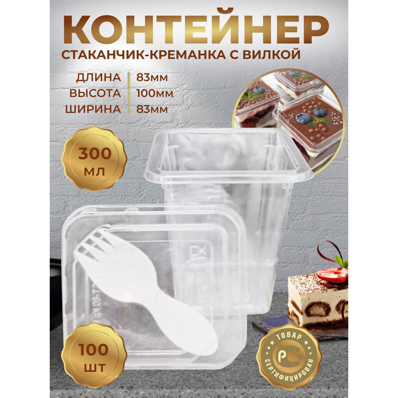 Стакан-креманка одноразовый 300 мл с крышкой и вилкой, 100 шт — набор емкость Д-280 + крышка Д-320КВ (ПЭТ) от производителя «Комус-Упаковка»