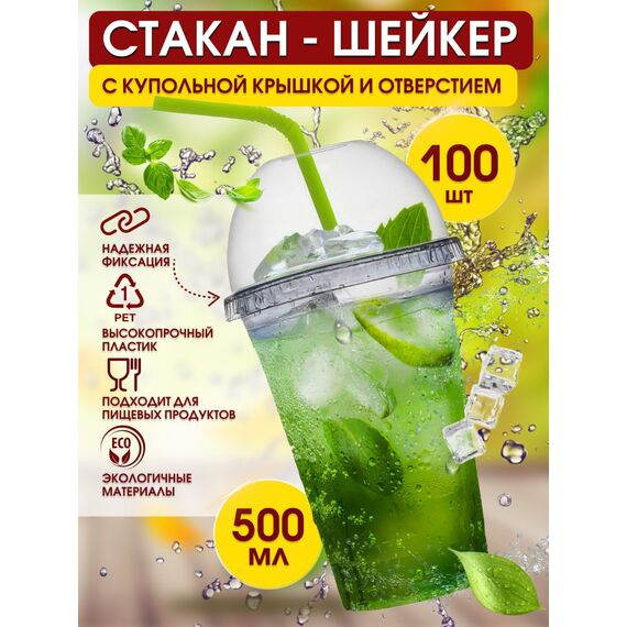 Идеальный комплект для напитков с трубочкой и десертов на вынос Представляем вам готовый набор из прозрачных стаканов-шейкеров объемом 500 мл и купольных крышек с отверстием для трубочки. Стаканы выполнены из прочного пищевого ПЭТ, крышки плотно фиксируются, обеспечивая герметичность и сохранность содержимого. Купольная форма крышки позволяет украшать напитки взбитыми сливками, мороженым, фруктами и ягодами, а отверстие удобно для трубочки . Упаковка 100 штук — оптимальный выбор для активных кафе, кофеен и служб доставки.