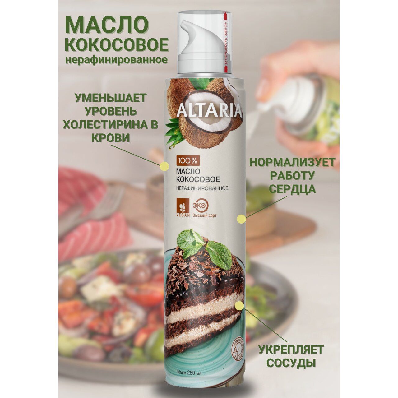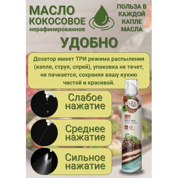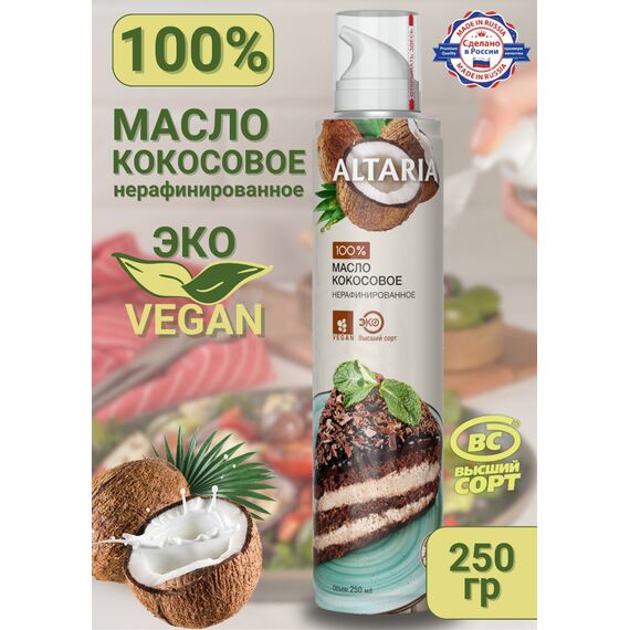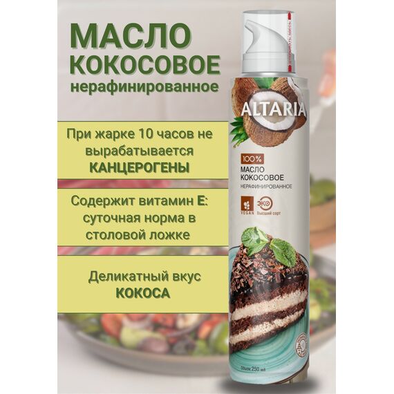 ? Тропическое золото в удобном формате Представляем вам уникальный ЭКО-продукт от бренда Altaria — 100% чистое нерафинированное кокосовое масло первого холодного отжима в инновационном формате спрея. Кокосовое масло обладает нежным, сладковатым вкусом и изысканным ароматом, который перенесет вас в тропическую сказку . Это настоящий тренд на рынке здорового питания благодаря своим полезным свойствам и универсальности .