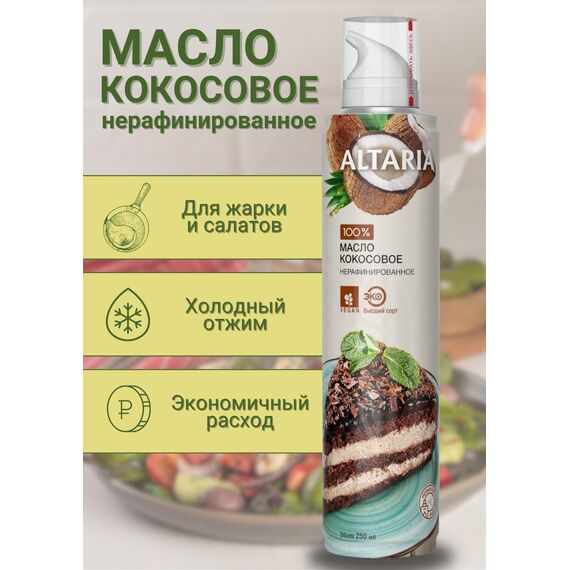 Масло кокосовое нерафинированное Altaria с распылителем, 250 мл — ароматный тропический деликатес для кулинарии и красоты