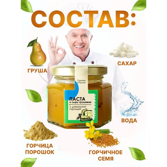 Натуральный состав Только груша, дижонская горчица и минимум сахара. Никаких искусственных добавок, красителей и консервантов. Мы сохранили чистоту вкуса и пользу натуральных ингредиентов.