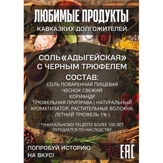 Встреча кавказских традиций и итальянской роскоши Представляем вам уникальную версию адыгейской соли — с добавлением благородного черного трюфеля. Трюфель по праву считается "королем грибов" и ценится гурманами по всему миру за свой неповторимый, сложный аромат с землистыми, ореховыми и мускусными нотками. В сочетании с традиционным составом адыгейской соли (чеснок, кориандр, травы) трюфель создает поистине королевский букет, способный превратить самое простое блюдо в ресторанный шедевр.