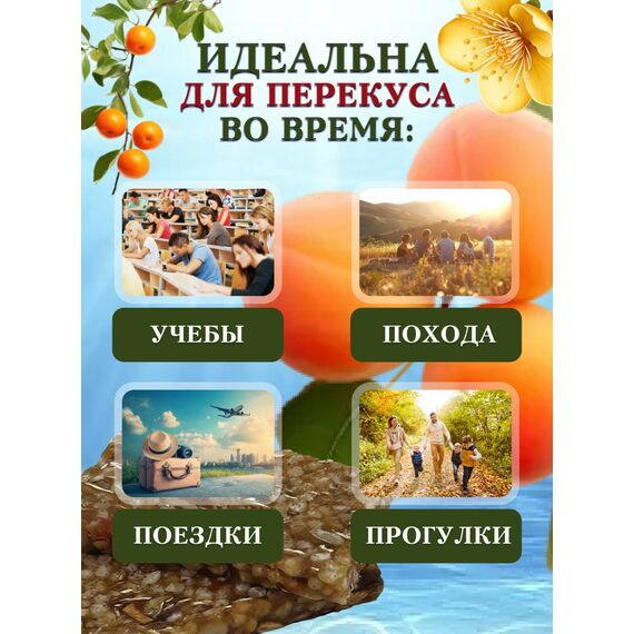 | Солнечный абрикос | Сушеный абрикос (курага) богат калием, магнием и витамином А, полезен для сердца, зрения и иммунитета. Природная сладость без сахара. |