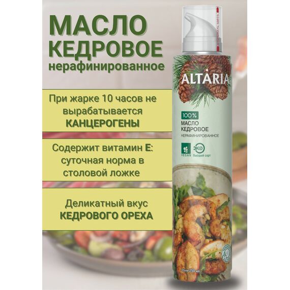 ? "Лекарство от ста болезней" в удобном формате Представляем вам уникальный продукт от бренда Altaria — 100% чистое нерафинированное масло из ядер сибирского кедра . Это масло издавна ценилось как деликатес и природное лекарство. Кедровое масло содержит огромное количество минеральных веществ, витаминов и полиненасыщенных жиров . Оно приравнивается к деликатесу, его вкусовые качества просто великолепны, поэтому оно очень популярно в кулинарии . Несколько капель кедрового масла придадут пикантную нотку любому блюду .