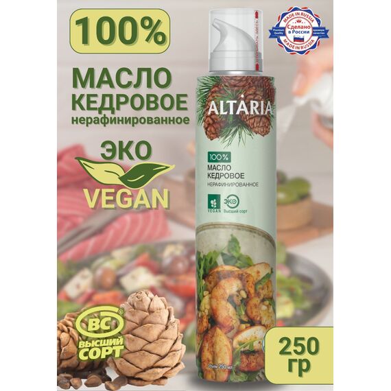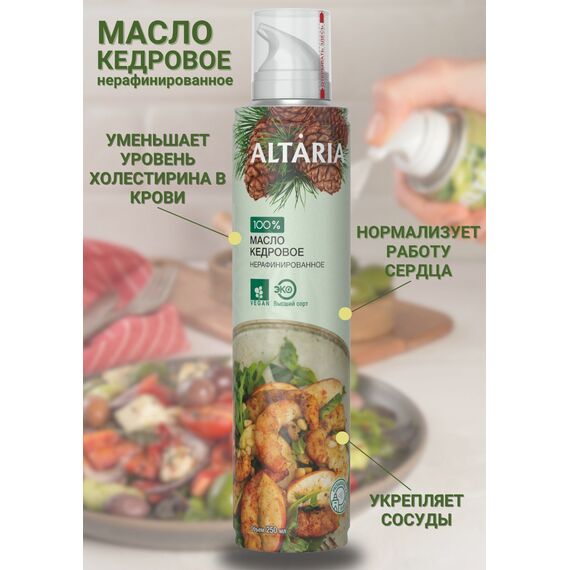 ? ЭКО-продукт из Алтайского края Altaria — российская компания из Алтайского края, специализирующаяся на производстве высококачественных растительных масел. Продукция бренда отличается экологической безопасностью и натуральностью . Масло произведено методом первого (холодного) прессования из прошедших строгий отбор орехов сибирского или дальневосточного кедра без применения консервантов и красителей .