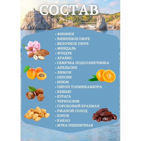 Состав: финики, вишневое пюре, яблочное пюре, миндаль, фундук, арахис, семечка подсолнечника, апельсин, лимон, персик, изюм, сироп топинамбура, кешью, курага, чернослив, гороховый крахмал, ржаной солод, кэроб, какао, мука пшеничная, мука кукурузная, кокос, красная рябина, гибискус, лаванда, лепестки розы, корица, мята, имбирь, кориандр, гвоздика, кардамон, душистый перец, соль морская .