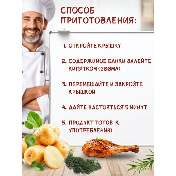 Вкус и удобство Нежное картофельное пюре в сочетании с мясом говядины и аппетитными хрустящими сухариками создает полноценное, сбалансированное блюдо, которое отлично утоляет голод. Формат стаканчика позволяет насладиться обедом где угодно, без необходимости мыть посуду.
