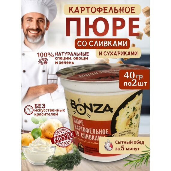 Горячий обед с нежным сливочным вкусом за минуту Представляем вам картофельное пюре с нежными сливками и хрустящими сухариками от бренда BONZA. Это идеальное решение для быстрого перекуса в офисе, на учебе, в походе или дома. Продукт уже находится в удобном пластиковом стаканчике — вам не нужна дополнительная посуда. Достаточно залить содержимое горячей водой, перемешать, подождать несколько минут, и ароматное, нежное пюре со сливочным вкусом готово. В упаковке 2 отдельных стаканчика по 40 г.