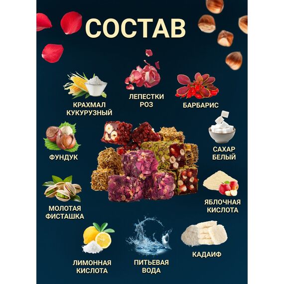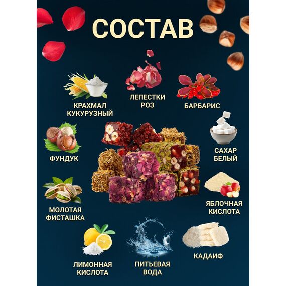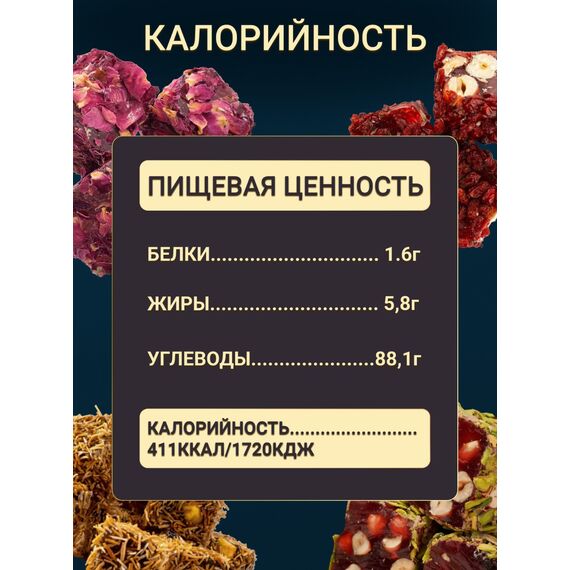 Наш рахат-лукум "Фундук на гранатовом соке" — это дань тем самым традициям. Нежные, слегка тягучие кубики на основе натурального гранатового сока скрывают внутри цельные ядра отборного фундука, создавая идеальный баланс кислинки, сладости и благородного орехового вкуса.