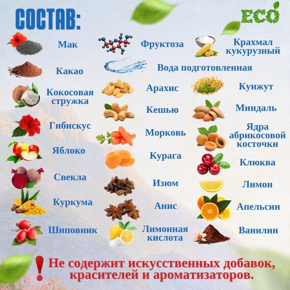 Состав: финики, вода, курага, изюм, чернослив, инжир, виноградный сок, банан, гороховый крахмал, кукурузный крахмал, кунжутная паста, арахисовая паста, грецкий орех, кунжут, арахис, цикорий (пребиотик-инулин), кокосовая мука, сливовое пюре, кэроб, миндаль, семена чиа, какао, пророщенная рожь, семечка подсолнечника, гороховый изолят, кокос, мак, колючелистник, кукурузная мука, гречневая мука, овсяная мука, красная рябина, агар-агар, гвоздика, фенхель, душистый перец .