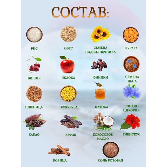 Состав: рис, овес, семена подсолнечника, курага, вишня, яблоко, финики, семена льна, пшеница, кукуруза, патока, сироп цикория (инулин), какао, кэроб, кокосовое масло, гибискус, корица, соль розовая .