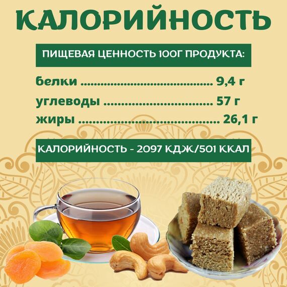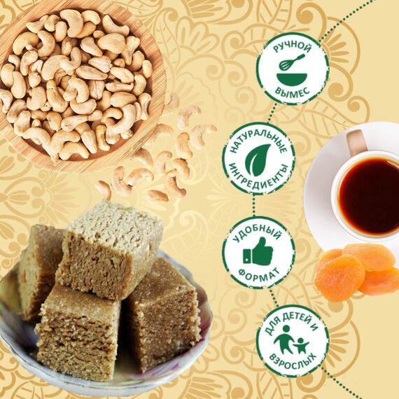 | Кешью в составе | Мягкий, сладковатый орех кешью придает халве бархатистую текстуру и изысканный вкус. |