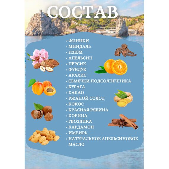 Состав: яблочное пюре, финики, миндаль, фундук, арахис, семечка подсолнечника, кешью, сироп топинамбура, гороховый крахмал, мука кукурузная, мука пшеничная, ржаной солод, кэроб, апельсин, лепестки роз, имбирь, корица, гвоздика, кориандр, душистый перец, соль морская .