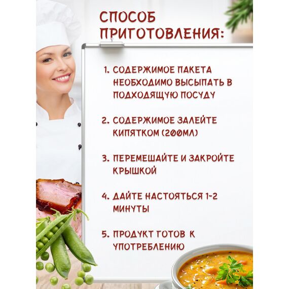 Вкус и удобство Насыщенный гороховый вкус, который напоминает домашний суп, отлично согревает и утоляет голод. Компактный формат пакетика позволяет всегда иметь под рукой горячий обед.