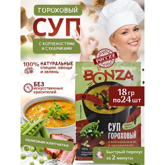 Суп гороховый быстрого приготовления BONZA, 18 г, 24 шт — оптовая упаковка сытного обеда в удобных пакетиках для заваривания в кружке