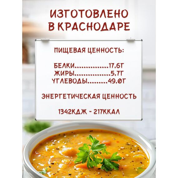 Вкус и удобство Насыщенный гороховый вкус, который напоминает домашний суп, отлично согревает и утоляет голод. Компактный формат пакетика позволяет всегда иметь под рукой горячий обед.
