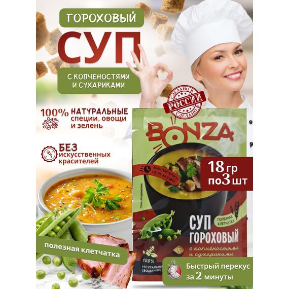 Суп гороховый быстрого приготовления BONZA, 18 г, 3 шт — сытный и ароматный обед в удобных пакетиках для заваривания в кружке