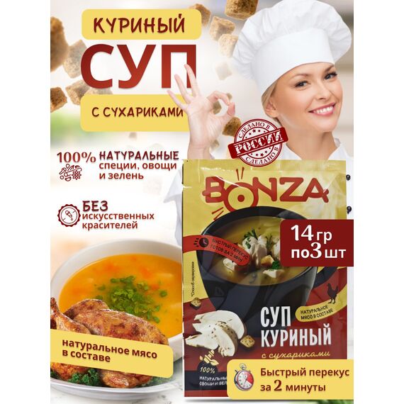 Горячий суп с классическим куриным вкусом за минуту — просто добавь воды Представляем вам куриный суп быстрого приготовления от бренда BONZA. Это идеальное решение для быстрого перекуса в офисе, на учебе, в походе или дома. Сухая смесь находится в компактном пакетике — легко хранить и удобно брать с собой. Достаточно высыпать содержимое пакетика в кружку, залить горячей водой, перемешать, подождать несколько минут — и нежный, ароматный куриный суп готов. В упаковке 3 отдельных пакетика по 18 г.