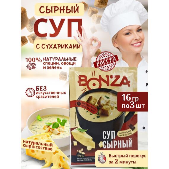 Суп сырный быстрого приготовления BONZA, 18 г, 3 шт — нежный и ароматный обед в удобных пакетиках для заваривания в кружке