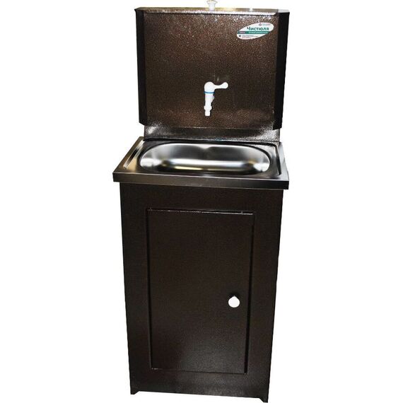 Бак - черный металл, Объем бака - 17 л, раковина - нерж. Сталь, тумба - черный металл Нержавеющая раковина 50 х 40 см. Тумба поставляется в разобранном виде в коробке размером 80 х 54 х 20 см, вес 11,5 кг. Габаритные размеры в собранном виде, мм 1280Х500х460 Умывальник дачный выполнен из высококачественной стали 0,7 мм, окрашен крепкой краской различных цветов: серебро, белый, медь, белое золото, лагуна. Конструкция умывальника Чистюля составная: включает в себя тумбу, которая аккуратно скрывает способ слива воды и позволяет осуществлять водоотвод в канализацию или отдельную емкость и бак с пластиковым краном.