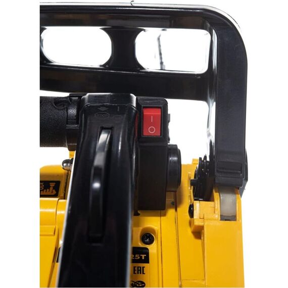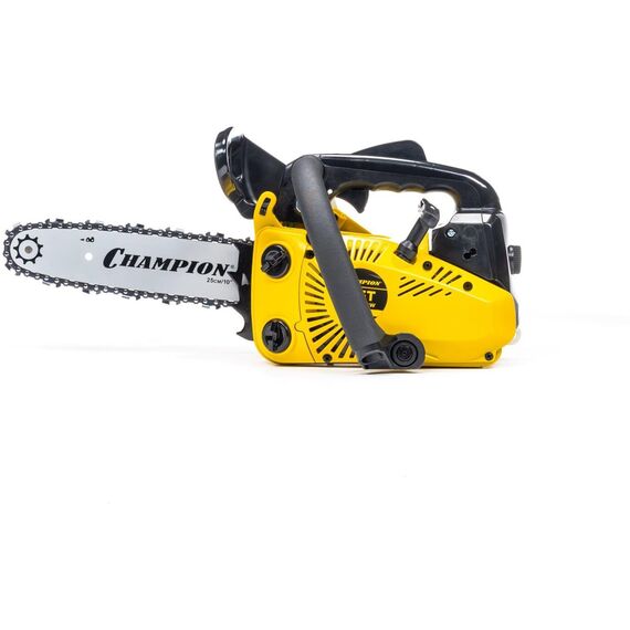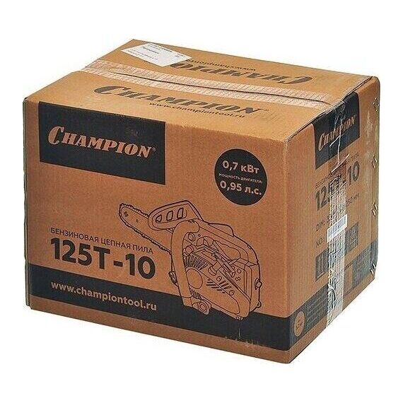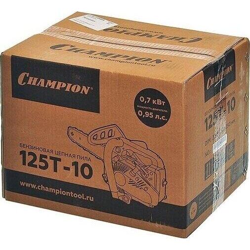 Бензопила CHAMPION 125T 10" 125T-10 служит для распила древесины, валки и раскряжевки деревьев, спиливания ветвей. Для повышения безопасности в данной модели предусмотрены цепной тормоз для мгновенной остановки цепи при отскоке, который также является щитком для зашиты руки оператора, также уловитель цепи, исключающий травмы при её обрыве. Вес, кг 3,2. Длина шины, см 25. Класс пилы бытовая.Объем двигателя, см3- 25,4. Объем масляного бака, л 0.16. Емкость топливного бака, л 0.23. Уровень шума, дБ(А) 108. Шаг цепи, дюйм 3/8 (0.375). Ширина паза, мм 1.3.Свеча зажигания L8RTF. Количество звеньев 40. Мощность (л.с.) 0,95. Мощность (кВт) 0,7. Габариты, мм 320х250х250.