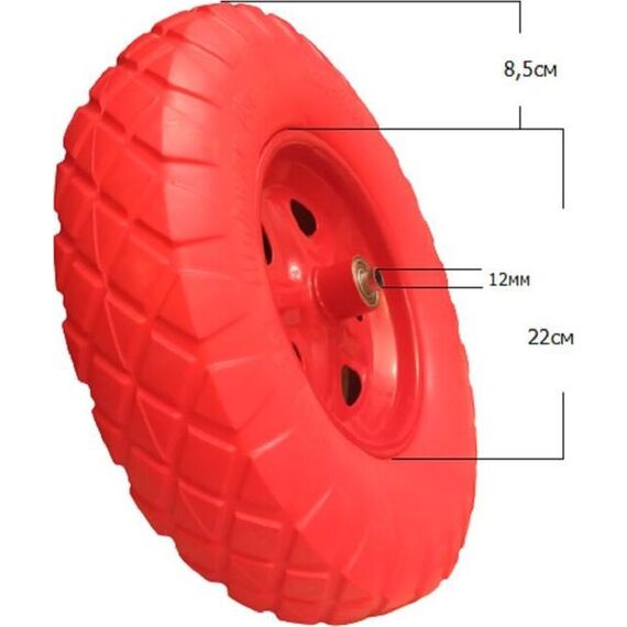 Полиуретановое (литое) колесо. Посадочное отверстие 12мм, диаметр 39см. Используется только на двухколесных тачках.